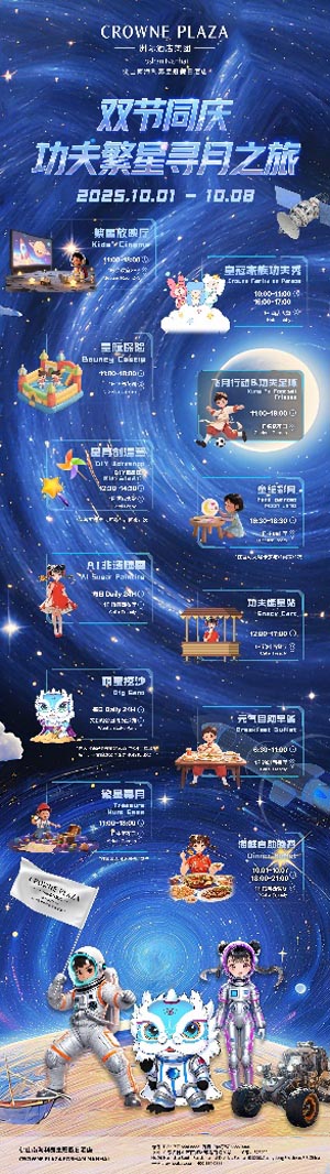 国庆中秋假期期间,酒店为每一个心怀好奇的“星际小探险家”准备了丰富多样的趣味活动。小朋友可参与“繁星寻月”寻宝活动,凭借智慧与勇气寻找月亮线索,解锁惊喜奖励;还可体验彩绘月亮灯、DIY星星棒与国旗风车,感受手作的乐趣;更有皇冠家族功夫秀、儿童电影院、草坪充气城堡、功夫足球、趣玩飞盘及萌宝挖沙等多项活动,让孩子在假日感受中华功夫文化与节日欢愉氛围!