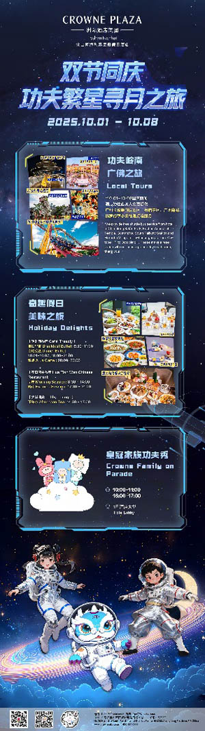 金秋十月,喜迎华诞。佛山南海利泰皇冠假日酒店精心呈现以一场融合岭南功夫与星月意趣的广佛假日体验,10月1日至8日,酒店以“国庆功夫繁星寻月之旅” 为主题,精心打造系列特色活动与体验,诚邀每一位“星际小探险家”携家人挚友,怀揣智慧与勇气,共赴这场兼具欢乐、团圆与美味的假日之旅。