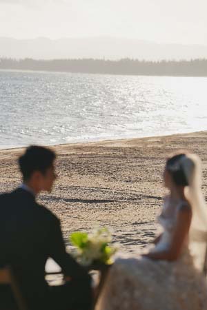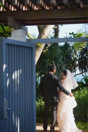 (新人从别墅小径走向海滩)
