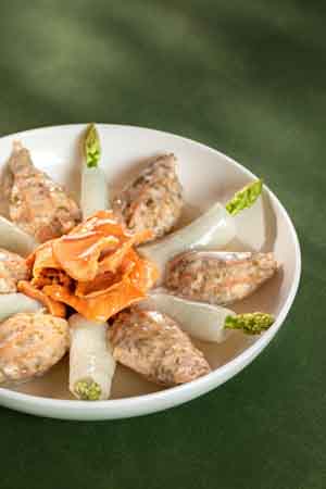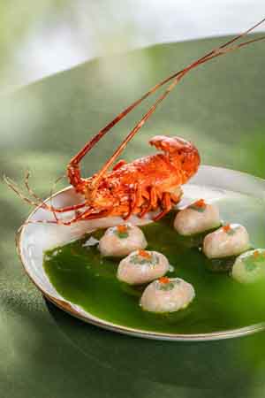 “翡翠水晶龙虾带子球” 严选整只本港青龙虾,肉质弹嫩饱满,搭配鲜甜带子与当季春笋粒,一同包裹进晶莹剔透的水晶皮中。以蛋白垫底,淋上用荠菜汁、清鸡汤与瑶柱汁调制的翡翠鲜汁,清鲜交融,色泽翠绿。咬破水晶皮,虾肉与带子的鲜甜、春笋的脆爽在舌尖绽放,海陆双鲜融于一口,清雅而不失层次。