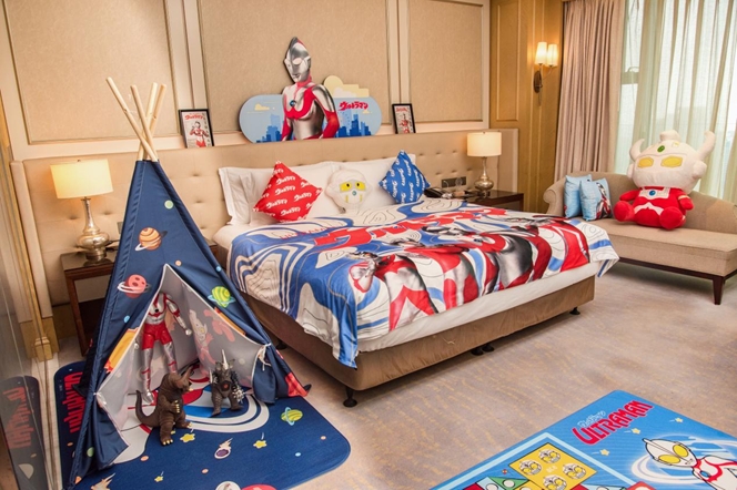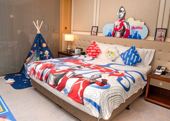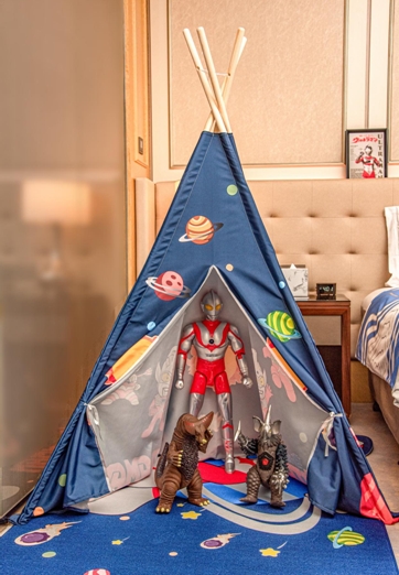 入住豪华客房,尊享朗廷酒店奥特曼主题客房,从床头到沙发到浴室,随处可见奥特曼的装饰:沙发上摆放的可爱大公仔;趣味十足的小帐篷里正上演着奥特曼大战小怪兽的精彩环节。