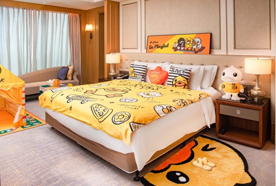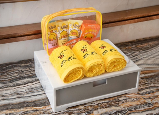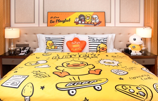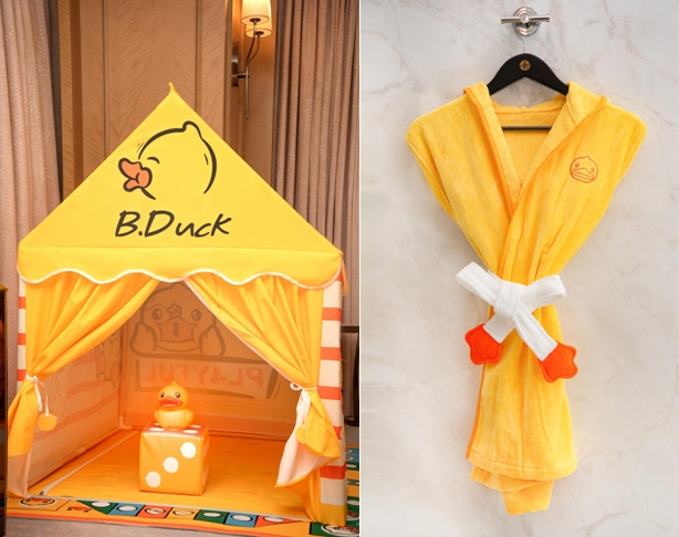 入住朗廷酒店B.Duck小黄鸭主题客房,蛋黄色的可爱身影,出现在床头床尾,毛茸茸的活力与亮黄色的元气,点亮整个房间。从床头柜摆放的软萌小黄鸭到充满巧思布置的浴室,每一个小细节都萌化你的心。