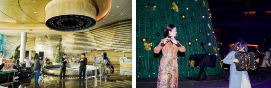 在圣诞点灯仪式开启前,酒店精心筹备的轻音乐会宛如一场听觉的盛宴,在酒店的地心平台奏响。这已经是酒店今年举办的第三场轻音乐团演出了,每一次都给宾客带来不一样的感动。现场,舒缓而美妙的音符在空中飘荡,仿佛是灵动的精灵,轻轻拂过每一个人的心田,让人不自觉地沉浸其中,忘却了一切烦恼与疲惫。不少宾客原本只是路过,却被这动人的音乐吸引,纷纷驻足欣赏,原本略显空旷的地心平台渐渐围聚了许多听众,大家都在这美妙的音乐中,静静等待着即将到来的圣诞点灯仪式,让整个前奏都充满了浪漫与温馨的气息。