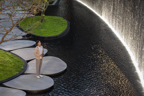 走出大堂,可直通酒店的1000平方米的户外泳池及戏水区,一处精心设计的下沉中庭极富意境之美,瀑布幕墙细流汇入潜池,与绿植搭配,在热闹的戏水区之前形成缓冲,带来一丝禅意。泳池区域被茂密的绿植环绕,无论白天还是夜晚,不同的美景,相同的惬意氛围。