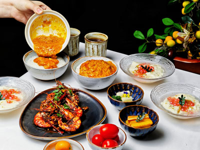 套餐主角蟹黄捞饭严选肥硕大闸蟹,拆解出金黄流油的蟹黄、鲜嫩弹牙的蟹肉,均匀铺陈于颗颗分明的五常大米之上,蟹香与米香彼此浸润,每一勺都饱含江海丰饶的醇厚鲜香。搭配西班牙风味经典蒜香黑虎虾,虾肉外焦里嫩,蒜香与海洋气息碰撞出别致风味;餐后的樱花爆珠豆花则以清甜爽滑平衡味觉,粉色爆珠在舌尖轻绽,为整道套餐画上温柔句点。