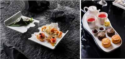 整场体验灵感源自中国传世名画《富春山居图》的焚毁传说:清末,藏家吴洪裕临终前将画卷投火焚烧,留下五处焦黑“火洞”,成为“断裂之美”的象征。下午茶定制器皿以“火洞”为核心意象,由宣纸与陶瓷泥烧制,并结合3D建模、3D打印与镀膜工艺,将传统与先锋感相融合;咸点盘则被设计为可拼合的两半,象征如今画作分别珍藏于浙江与台北的“断章”;构建出一幅“可品、可嗅、可观、可触、可感”的山水画卷,重塑“食物即展品”的当代表达。
