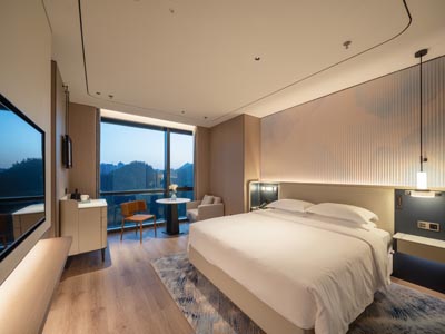 酒店拥有369间客房,涵盖地中海、加勒比、嘉年华等主题特色套房,配备智能马桶、戴森吹风机、私人露台花园等高端设施;臻选套房与商务客房兼顾功能性与设计感,令宾客在落日余晖中尽享山海诗意栖居。