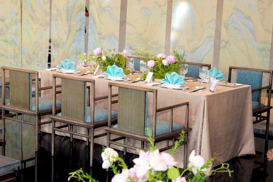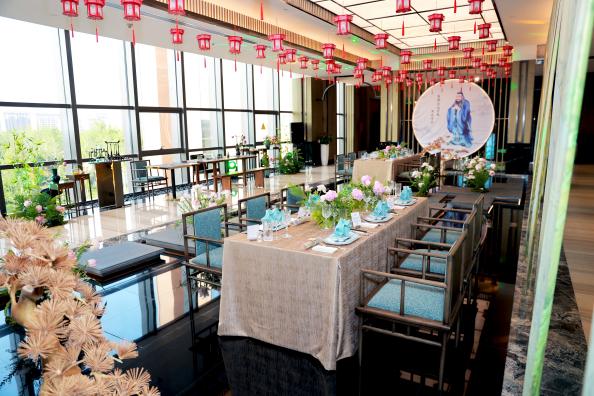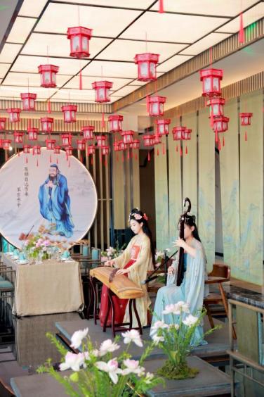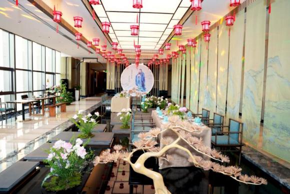步入乐轩华中餐厅中庭,中式美学以立体画卷之姿徐徐展开:《千里江山图》的水墨氤氲于丝绸吊幔间流转,故宫文创灯笼与芍药、荷花花艺相映成趣,泰山日出图与孔子圣像画遥相呼应,再现 “岱宗夫如何,齐鲁青未了” 的山水意境。