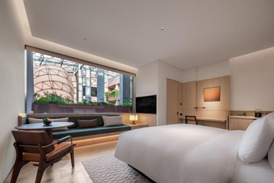 酒店客房分布于二至三层,面积从45平方米至205平方米不等,室内设计巧妙融合几何艺术与自然肌理,营造出兼具现代格调与诗意氛围的栖居之所。每间客房均配置戴森吹风机、欧珑沐浴用品及流金岁月品牌音响,并贴心定制精酿啤酒、枸杞黄酒及Tea’stone茶具与臻选原叶好茶,为宾客带来雅致且富有文化气息的入住体验。客房环绕中庭水景而设,并在长廊特别布置了施工纪实影像展,生动展现这座工业遗迹蜕变为当代艺术空间的历程。宾客还可通过酒店精心策划的艺术导览服务,深入了解每件艺术及建筑作品的幕后故事,于细节中沉浸领略艺术之美。
