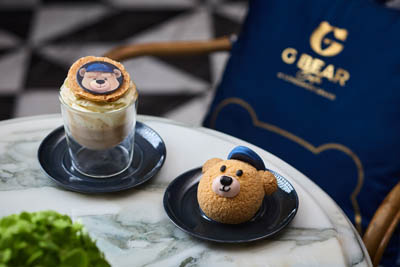G Bear Cafe的招牌饮品包括葡挞拿铁咖啡,上面有一块蛋挞酥皮饼干,饰有G Bear的生动形象,趣味十足;以及独特的葡挞阿法奇朵咖啡,葡挞风味的冰淇淋配以精心调制的意式浓缩咖啡,冰火交融,苦甜平衡。这里也限量供应一系列每日新鲜制作的特色甜点,包含巧克力棉花糖、覆盆子泡芙以及在社交媒体上爆红的迪拜巧克力——自制开心果酱混合中东芝麻酱及Katafil糕点碎粒,涂满丝滑的黑巧克力,层次丰富,滋味诱人。