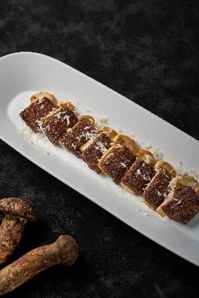 鱼子酱松茸片皮鸡则是馥郁之至,香脆爽口的片皮鸡,搭配鲜美松茸片,夹在特制酥皮上,加上鱼子酱搭配恰到好处,口感饱满富有层次。松茸香煎和牛亦是菌菇菜式的代表之一,选用M5加的和牛及高山松茸菌,极简的香煎技法更能让食客品味鲜菌与和牛的本真原味。珍菌白汁焖深海黄鱼亦是一道佳作,浓郁的汤汁由鸡、猪骨熬制四个小时后,加入鲜嫩珍菌入汤继续熬制,最后与炸至酥黄的深海黄鱼融合,让细嫩鱼肉充盈咸鲜香味,入口难以忘怀。