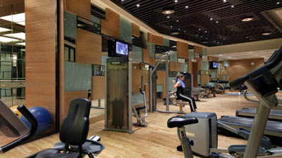 超过100平方米的健身空间,拥有国际品牌PRECORE最先进的健身器材,跑台配备电视信号和速度、心律测量显示屏。设备组合包括跑台、自行车、运转机、胸肌推举训练器、高拉力背肌训练器、大腿伸展器,腹肌练习椅、背肌练习椅,以及哑铃组合套装设施。